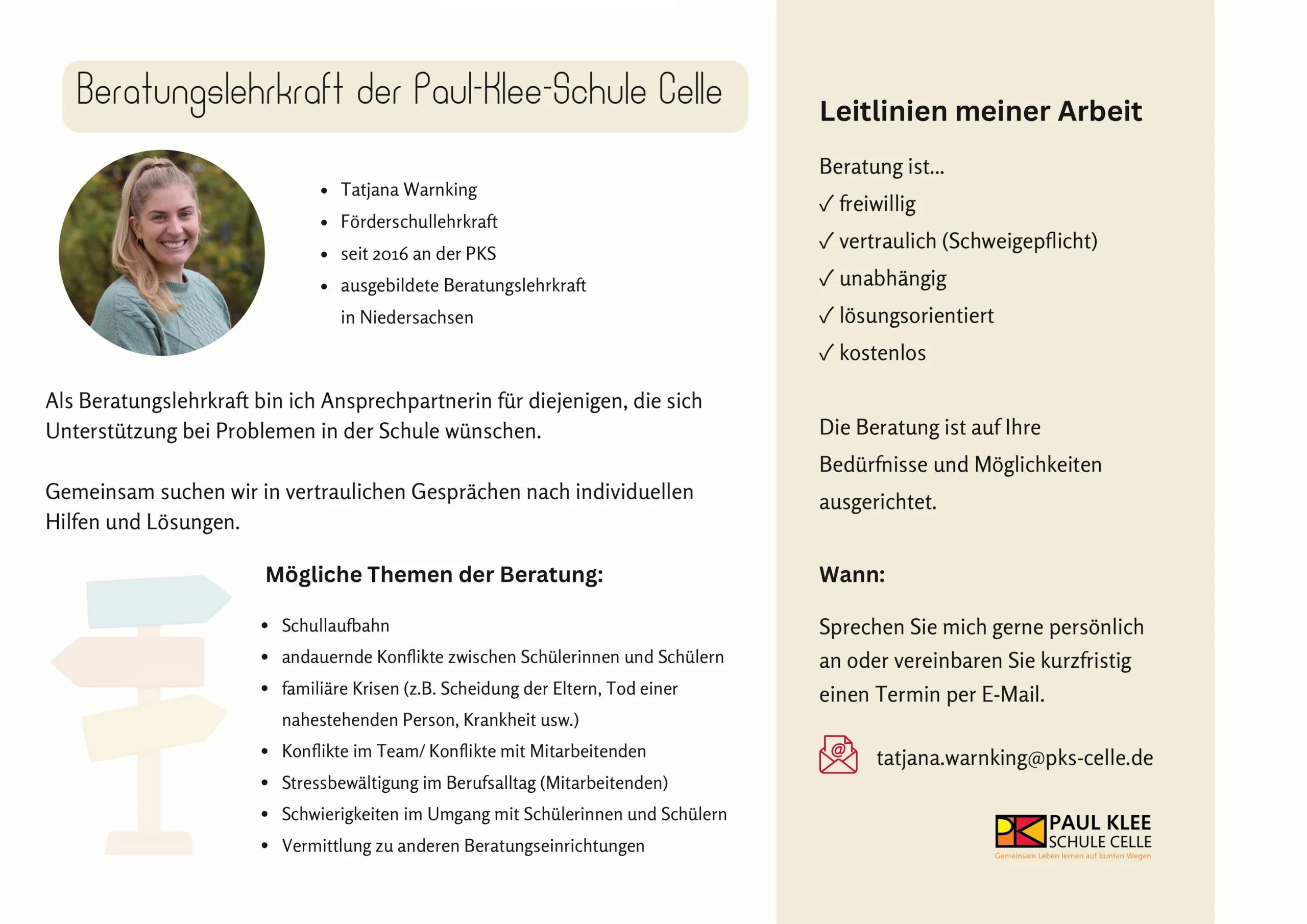 Tatjana Warnking steht ab sofort wieder als Beratungslehrkraft zu Verfügung. Sie ist Ansprechpartnerin für diejenigen, die sich Unterstützung bei Problemen in der Schule wünschen. In vertraulichen Gesprächen sucht sie nach individuellen Hilfen und Lösungen.